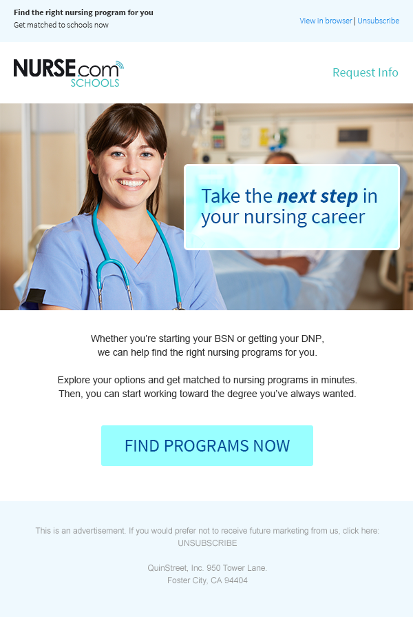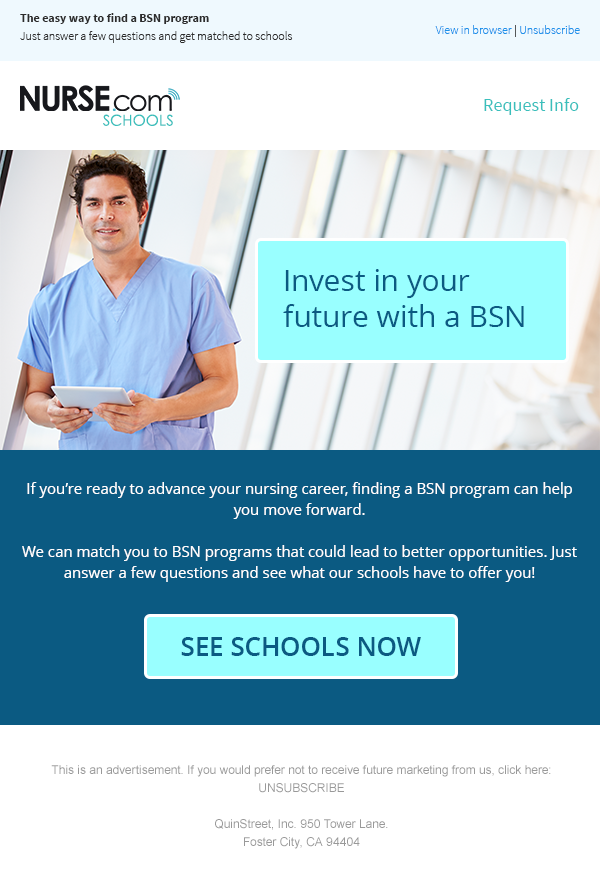 Emails for QuinStreet's site Nurse.com, both desktop and mobile versions.